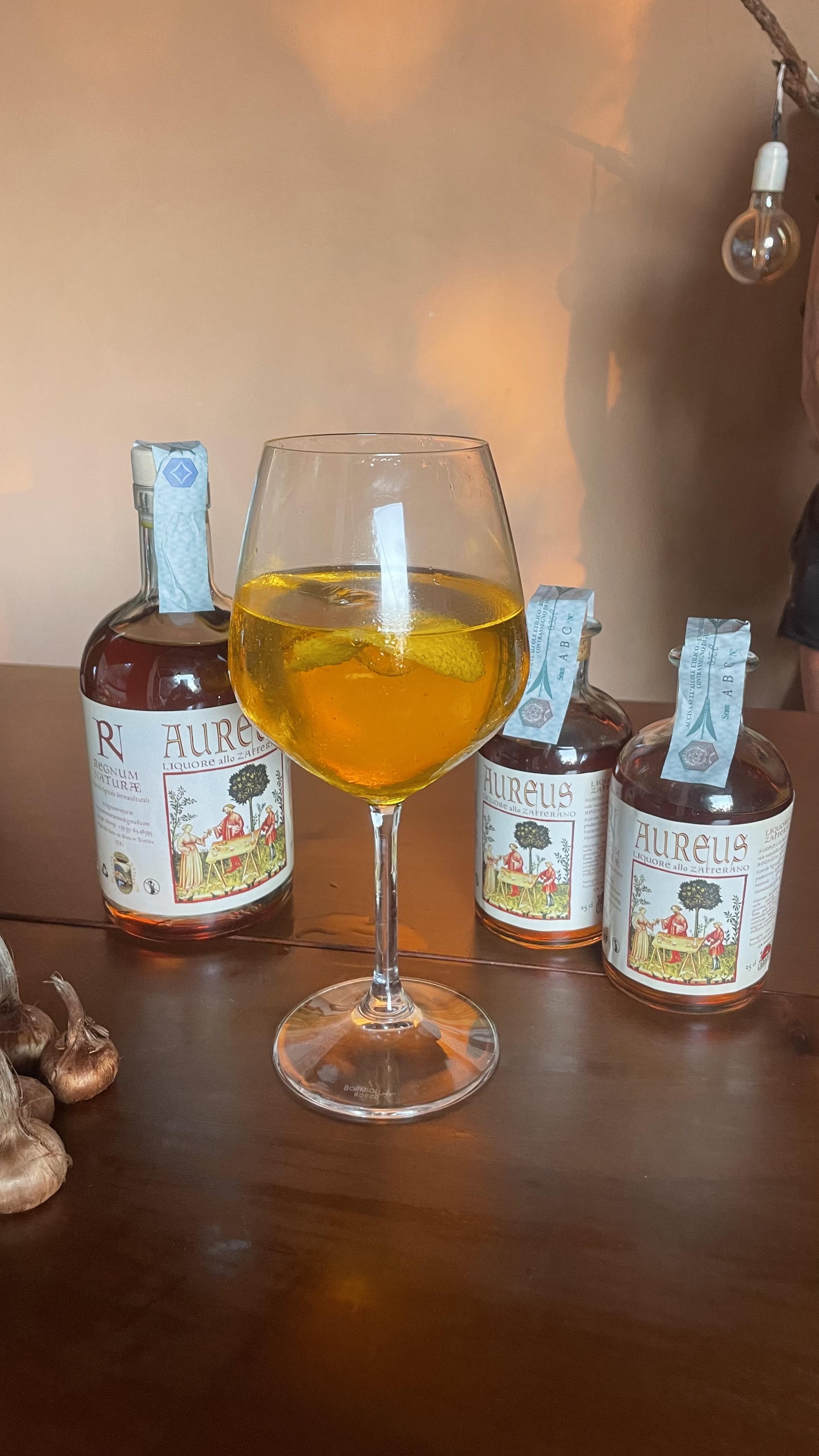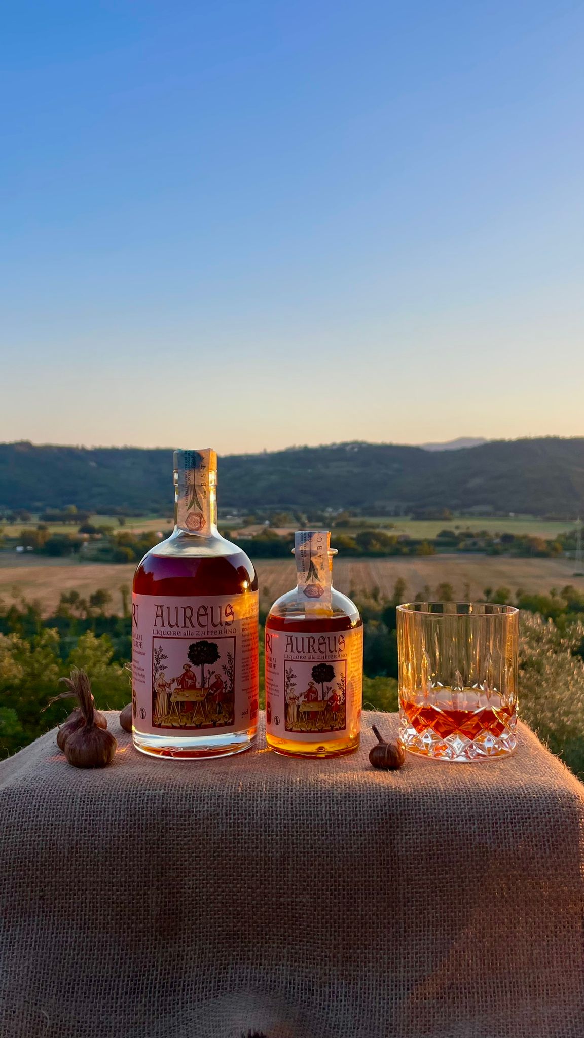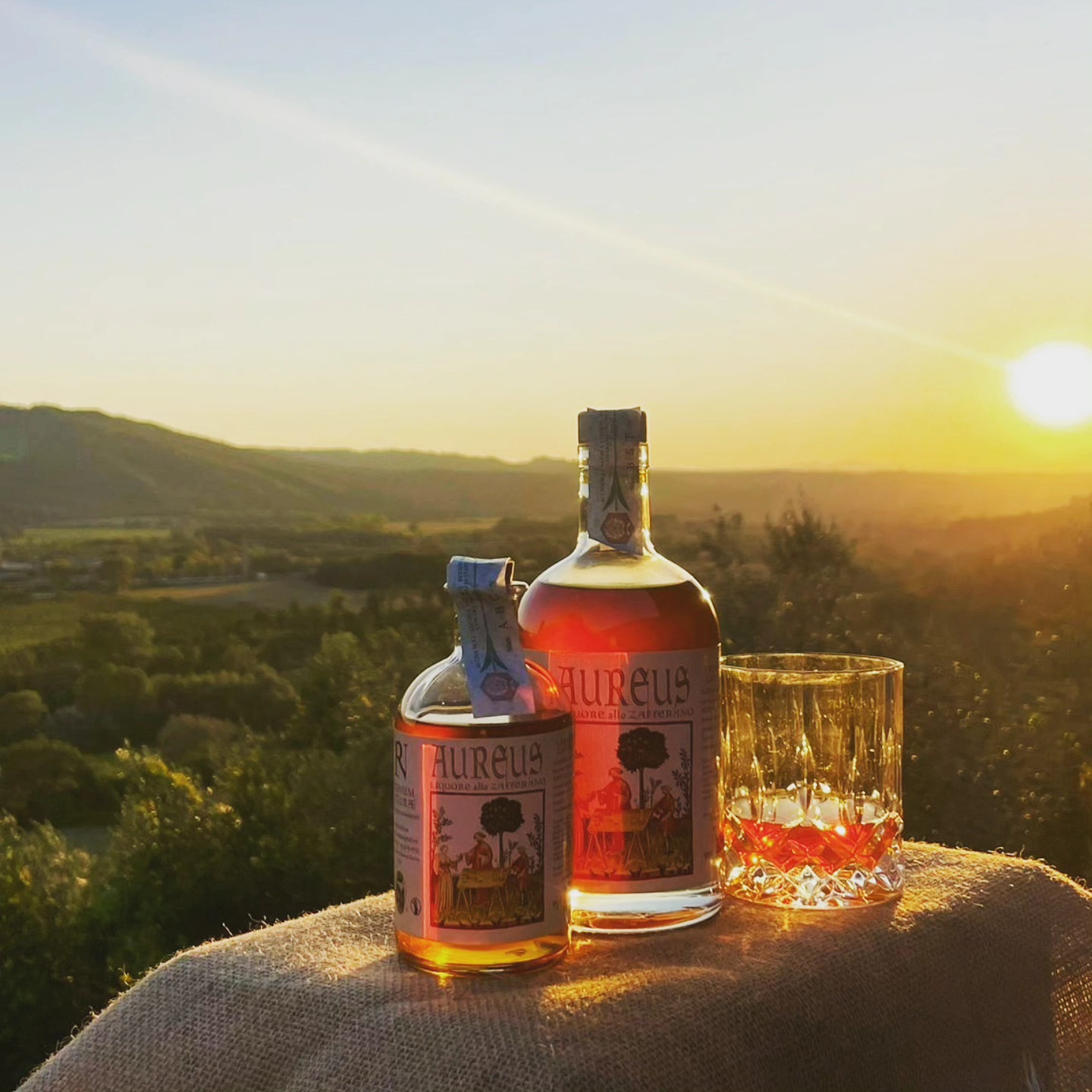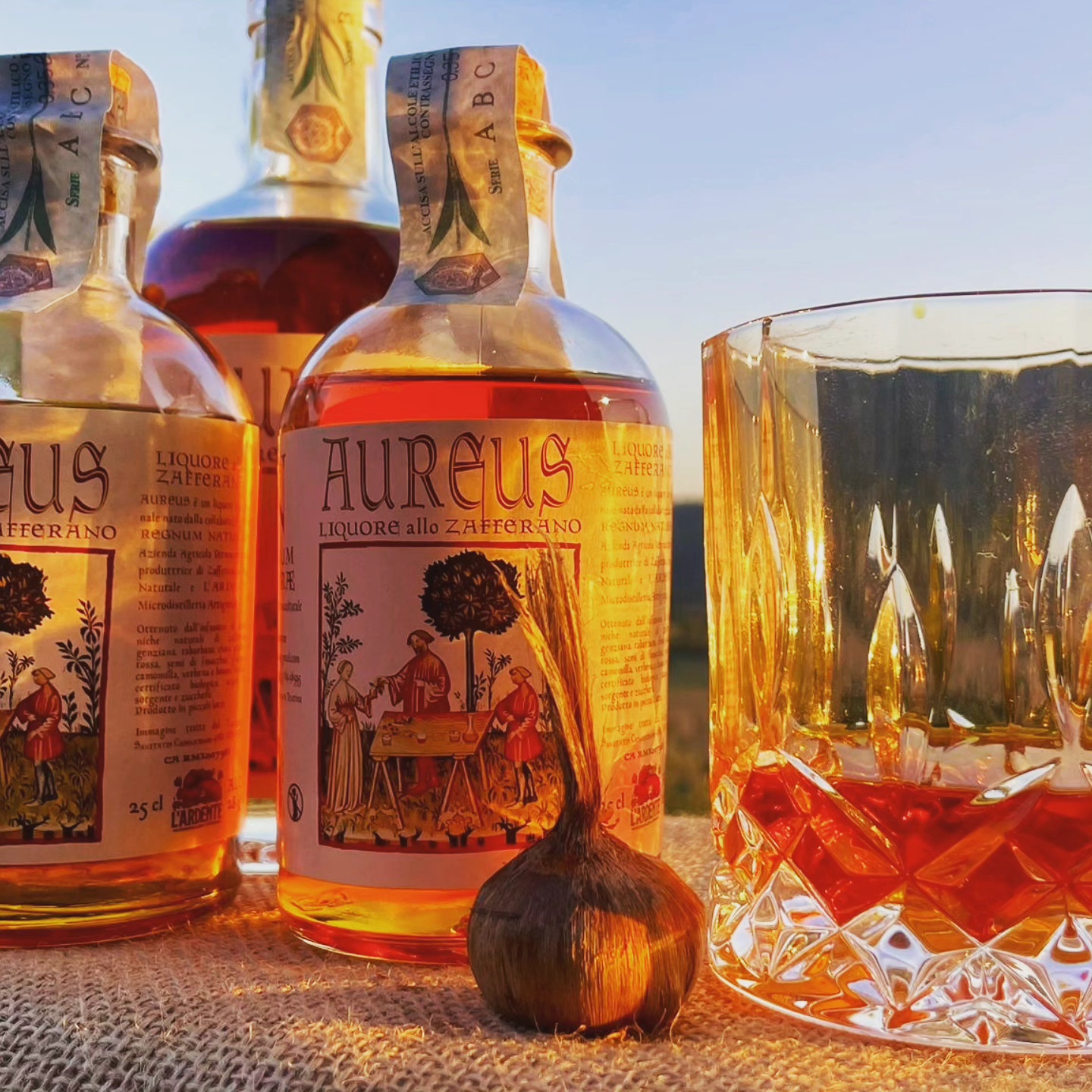 Liquore naturale e artigianale, ottenuto per infusione lenta di stimmi purissimi di zafferano e realizzato in piccole quantità senza aromi artificiali ne coloranti. Il colore ambrato intenso e il profumo avvolgente dello zafferano ne fanno un prodotto unico e raffinato. Dal gusto rotondo, caldo e persistente, AUREUS è ideale come digestivo a fine pasto, ma come aperitivo. Lasciati sorprendere dal nostro esclusivo cocktail da gustare al tramonto: Golden Hour, solo AUREUS con ghiaccio, prosecco, una scorzetta di limone e un rametto di rosmarino.